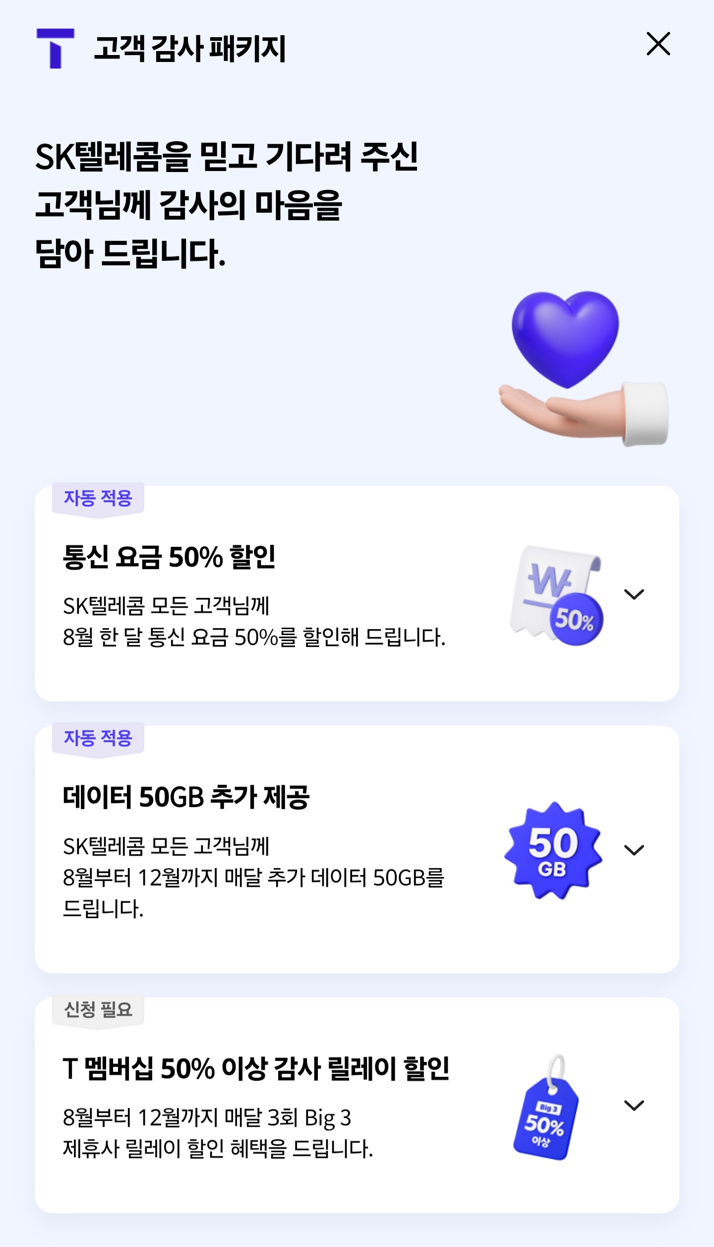 | ๋ฐ์ดํฐ 50GB ์ถ๊ฐ ์ ๊ณต | ๋งค๋ฌ ๋ฐ์ดํฐ 50GB ์ ๊ณต (์ด 250GB) | 8์~12์ (5๊ฐ์) | 2025.7.15 ๊ธฐ์ค SKT ์ ์ฒด ๊ณ ๊ฐ | โ ์๋ ์ ์ฉ | - ์ค๋งํธ๊ธฐ๊ธฐ ๊ณต์ , ํ ๋๋ง ๊ฐ๋ฅ - ๋ฆฌํ/๊ฐ์กฑ ๊ณต์ ๋ถ๊ฐ - ๋ฏธ์ฑ๋ ์๋ ์์ ๊ฑฐ๋ถ ๊ฐ๋ฅ |