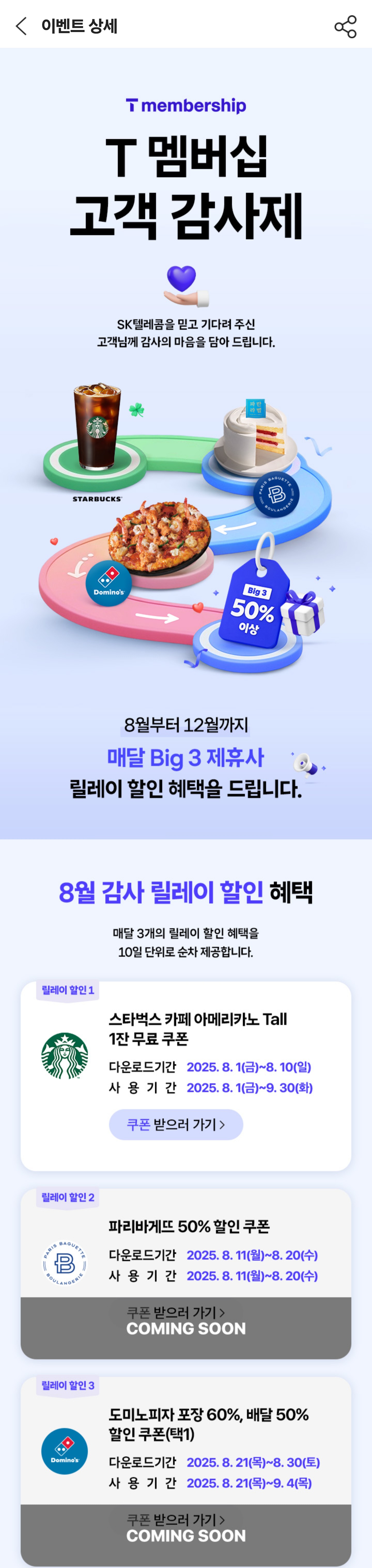 | Big 3 ๋ฆด๋ ์ด ํ ์ธ (T๋ฉค๋ฒ์ญ) | ๋งค๋ฌ Big 3 ์ ํด์ฌ ๋ฆด๋ ์ด ํ ์ธ (10์ผ ๋จ์ x 3ํ) | 8์~12์ (๋งค๋ฌ 3ํ) | T๋ฉค๋ฒ์ญ VIP, GOLD, SILVER ๊ณ ๊ฐ (T์ฐ์ฃผ Lite ์ ์ธ) | โ